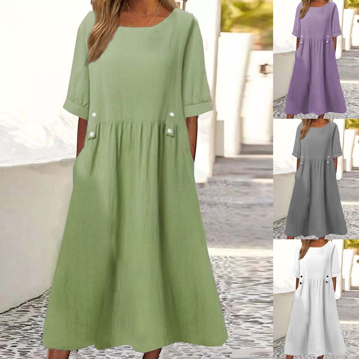 🔥👗Nové 2025 bavlnené a ľanové jednofarebné ležérne voľné módne šaty s okrúhlym výstrihom - pohodlné a všestranné na každý deň